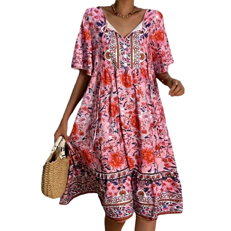 Small Floral V-neck Loose Casual Bohemian Vacation Style Dress