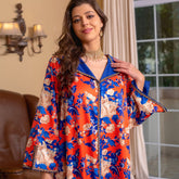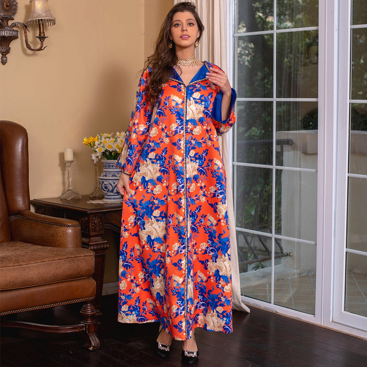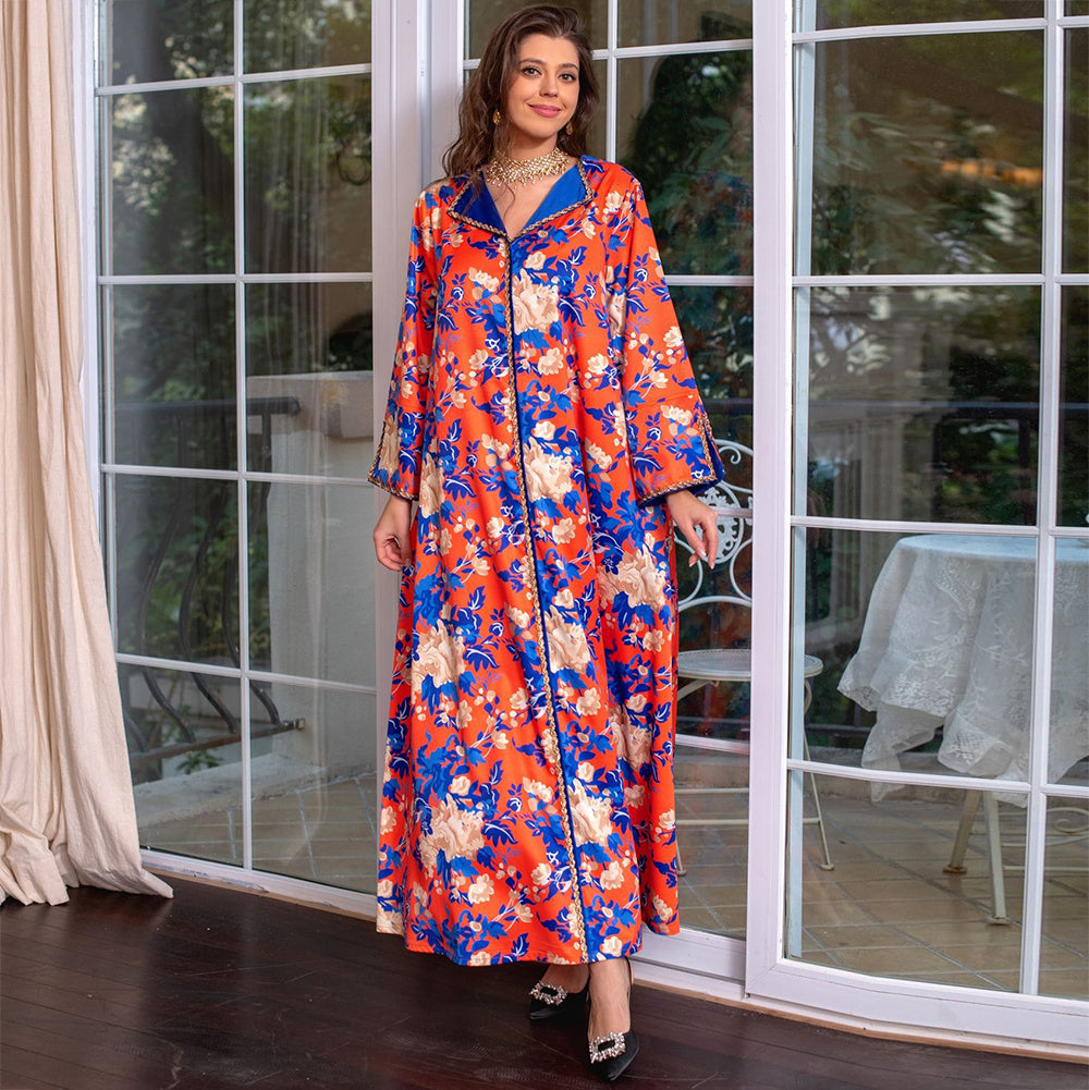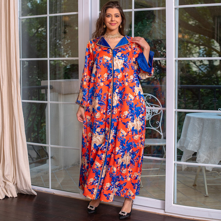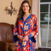 Sweet V-neck Color Contrast Printing Ribbon Splicing Rhinestone Flared Sleeve Kaftan Orange