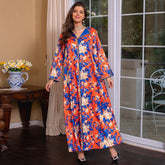 Sweet and graceful Arabic-style A-line long dress with a charming V-neckline and elegant bell sleeves.