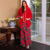 Sweet and modest long dress designed in an A-line silhouette with an elegant V-neck and dramatic bell sleeves.