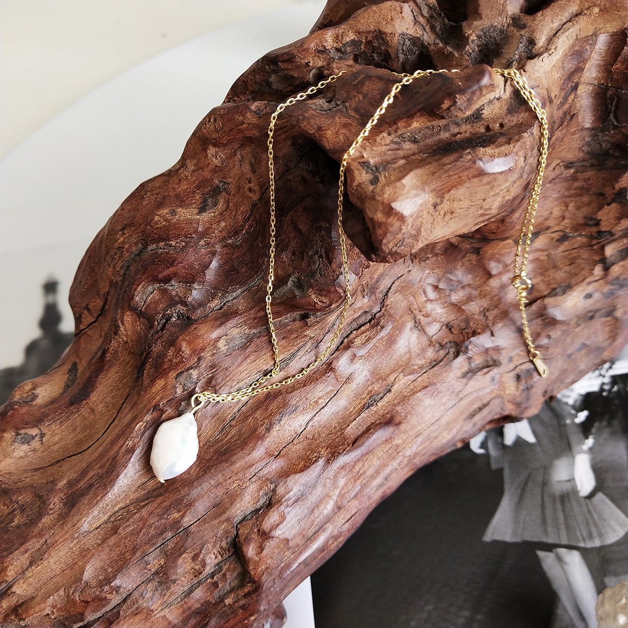 925 Sterling Silver Design Baroque Shaped Pearl Pendant Golden Necklace