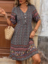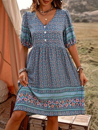 Flower Print Puff Sleeve Button Bohemian Style Dress