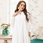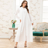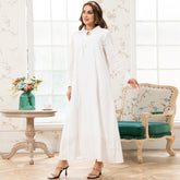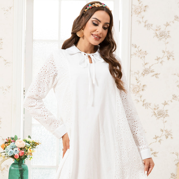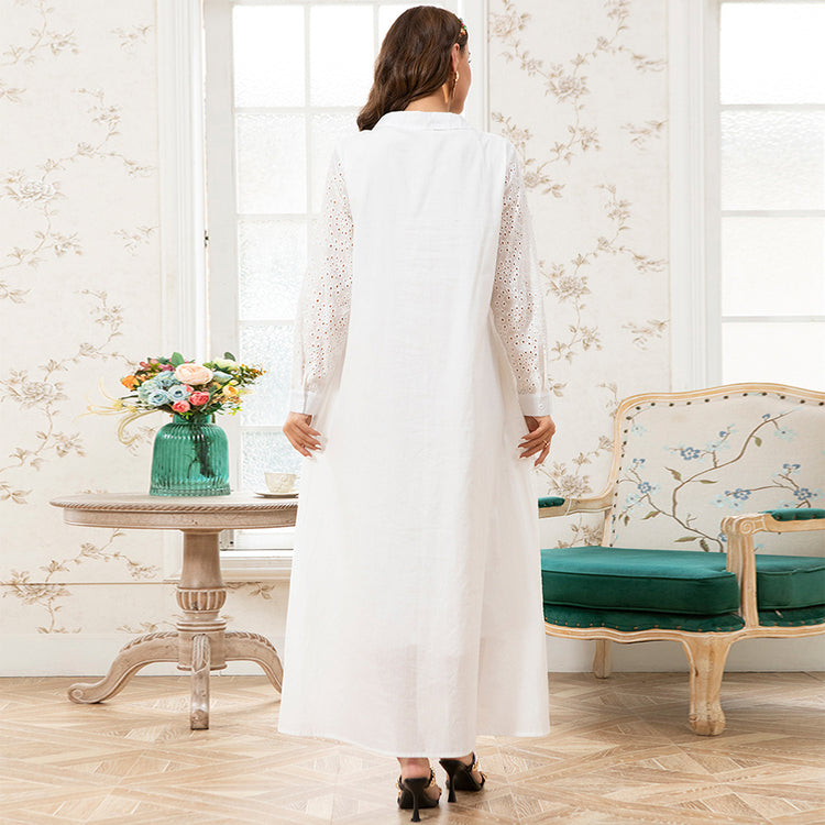 Holiday Style Lapel Solid Color Flowers Embroidery Lining Shirt Sleeve Long Dresses White