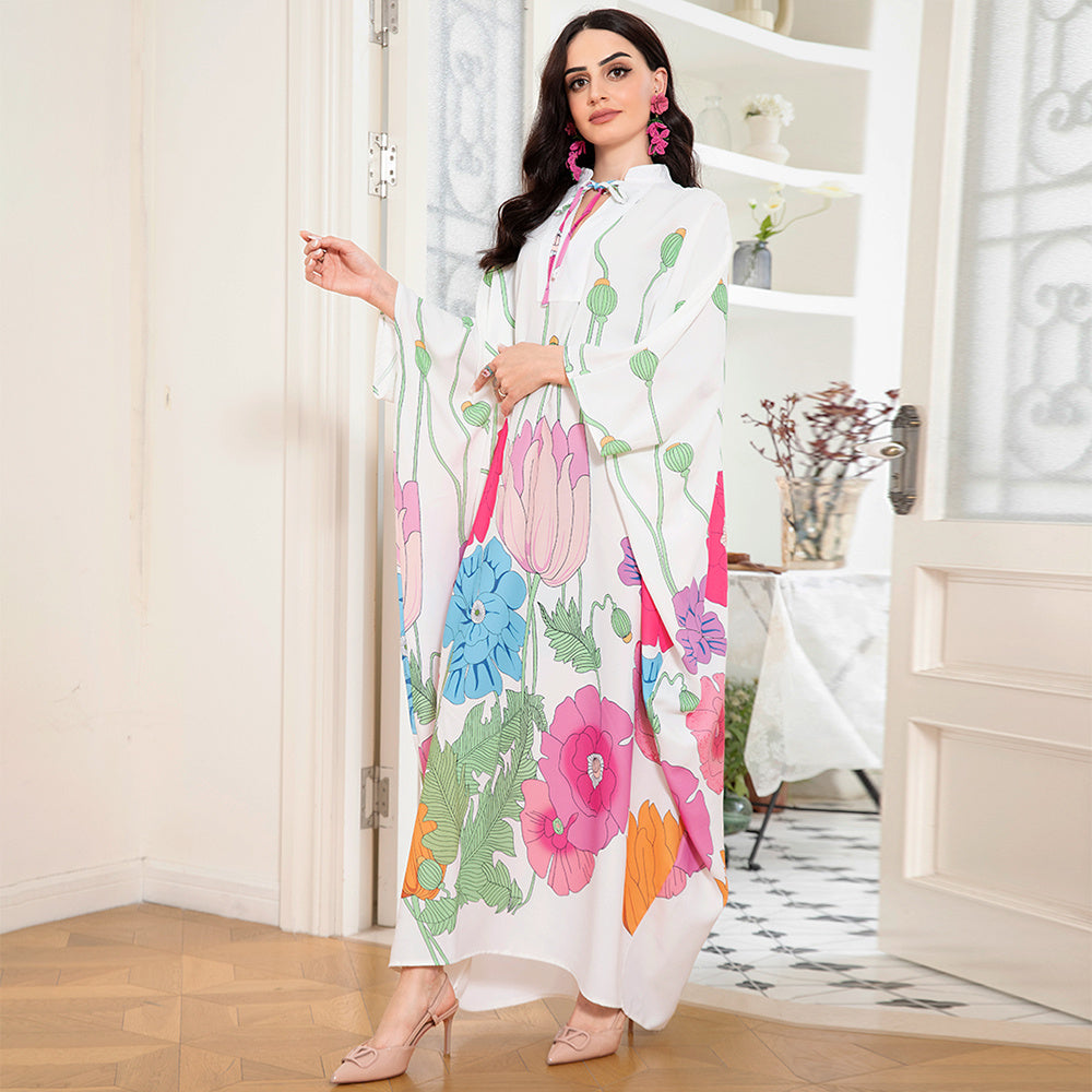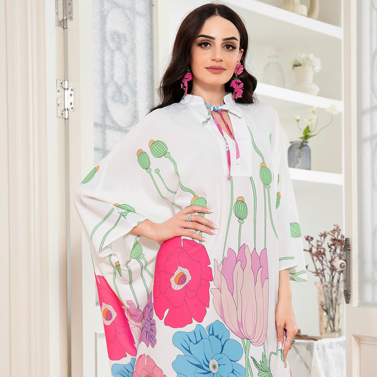 Holiday Style Sweet Round Neck Flowers Plant Raglan Sleeve Long Dresses White